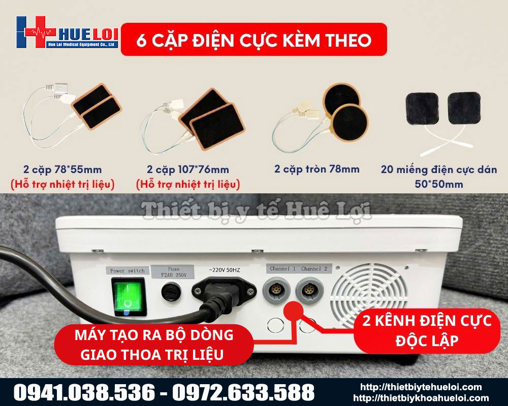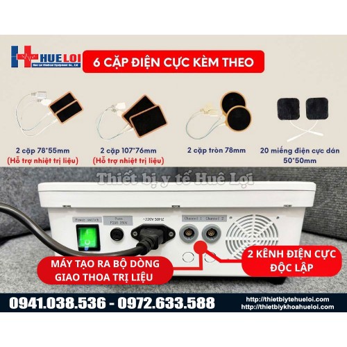 2 kênh độc lập Bộ điện cực đa dạng: 04 Điện cực gia nhiệt 107*76mm 04 Điện cực gia nhiệt 78*55mm 04 Điện cực tròn 78mm 20 Miếng điện cực dán 50*50mm |