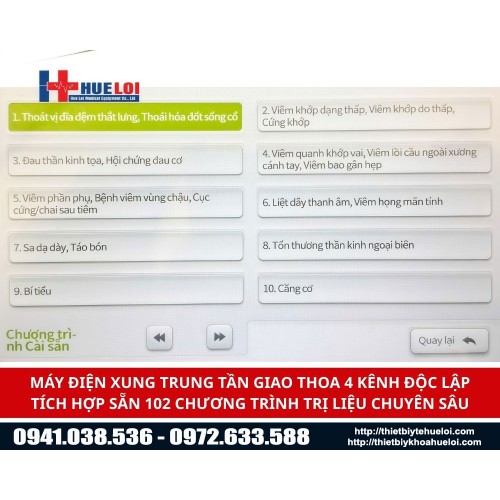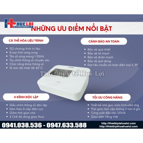 Giải pháp điện trị liệu tần số trung với nhiều thiết lập cảnh báo an toàn.