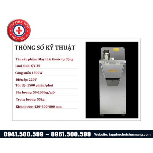 - Máy thái thuốc đông y tự động công suất lớn QY-20 tốc độ thái 1500 phiến thuốc 1 phút, sản lượng thái được tới 100kg dược liệu 1 giờ, có thể tùy chỉnh được độ dày phiến thuốc, chiếc máy thích hợp sử dụng trong các khoa bào chế thuốc của các bệnh viện hoặc phòng khám Y học cổ truyền.