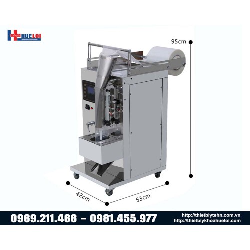 - Máy đóng gói chất lỏng Mini được sử dụng để đóng gói các loại chất lỏng túi nhỏ như gia vị gồm nước tương, nước mắm, nước đường, nước hoá chất, …. Máy nhỏ gọn có chân bánh xe giúp máy dễ dàng di chuyển trong nhà xưởng sản xuất.