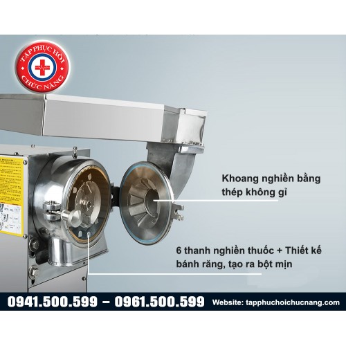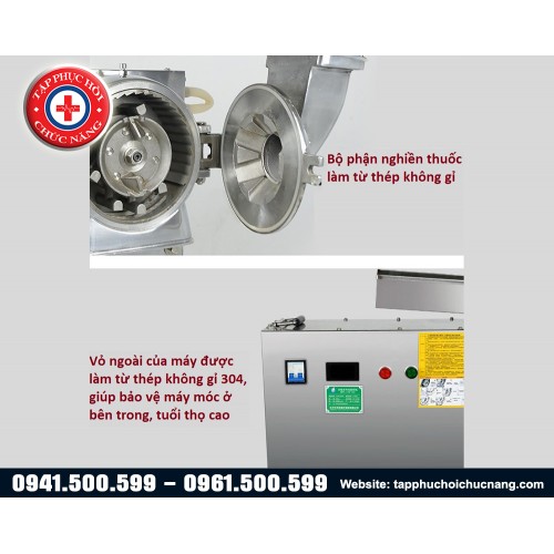 Máy nghiền thuốc đông y cao cấp có công dụng bào chế các vị thuốc động y thành dạng bột mịn hoặc tán bột để luyện hoàn. Máy làm việc tự động hoàn toàn, công suất làm việc cao, tốc độ làm việc nhanh, nghiền nhỏ được cả những vị thuốc cứng, thích hợp dùng cho các bệnh viện và phòng khám Y học cổ truyền, giúp tiết kiệm thời gian và công sức của nhân viên bào chế.