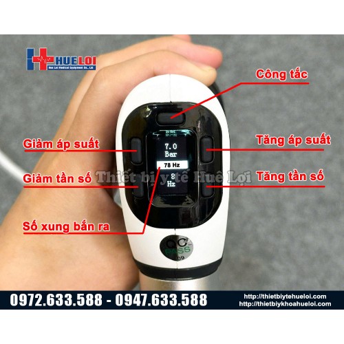 - Tay cầm tích hợp điều chỉnh tần số và cường độ, cho phép thao tác linh hoạt ngay trong quá trình điều trị mà không cần quay lại thân máy.