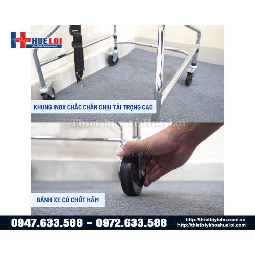 - Bánh xe có thể quay 360 độ, linh hoạt cho sự di chuyển của người bệnh, có chốt an toàn giúp người bệnh cảm thấy an toàn hơn.