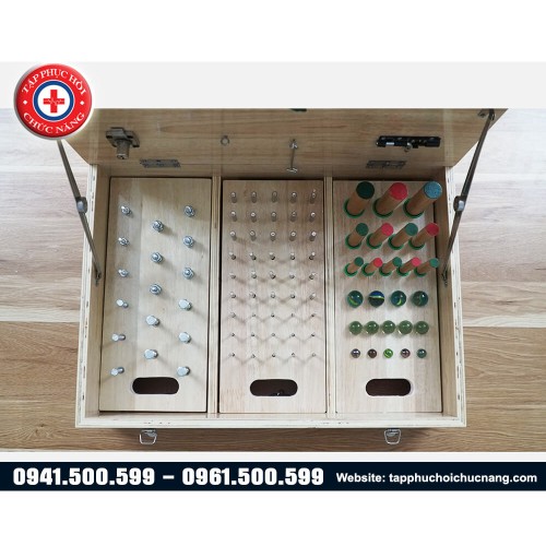 - Các bài tập: tập cho bi vào lỗ, tập cắm khối gỗ vào đúng chỗ, tập vặn ốc vít, tập khóa cửa, tập cài khóa ngang, tập bật công tắc.