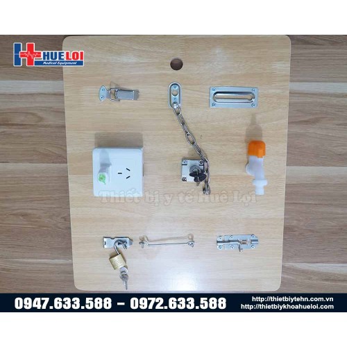 + 1 bảng gỗ lớn gồm một loạt các động tác thường nhật: bật tắt công tắc, cắm điện, cài khóa, khóa cửa, mở đóng vòi nước.