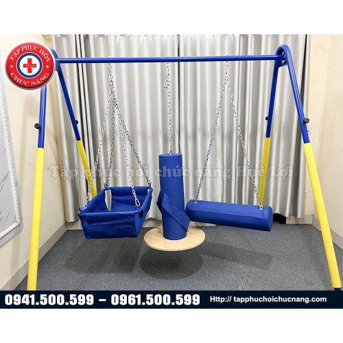 Thiết bị tập thăng bằng cho trẻ em dạng khung chữ A, bao gồm 1 bao ngồi nằm ngang, 1 bao ngồi ôm đứng dọc, 1 giỏ ngồi, vừa giúp trẻ em tập luyện cảm giác thăng bằng vừa có thể dùng làm dụng cụ vui chơi.